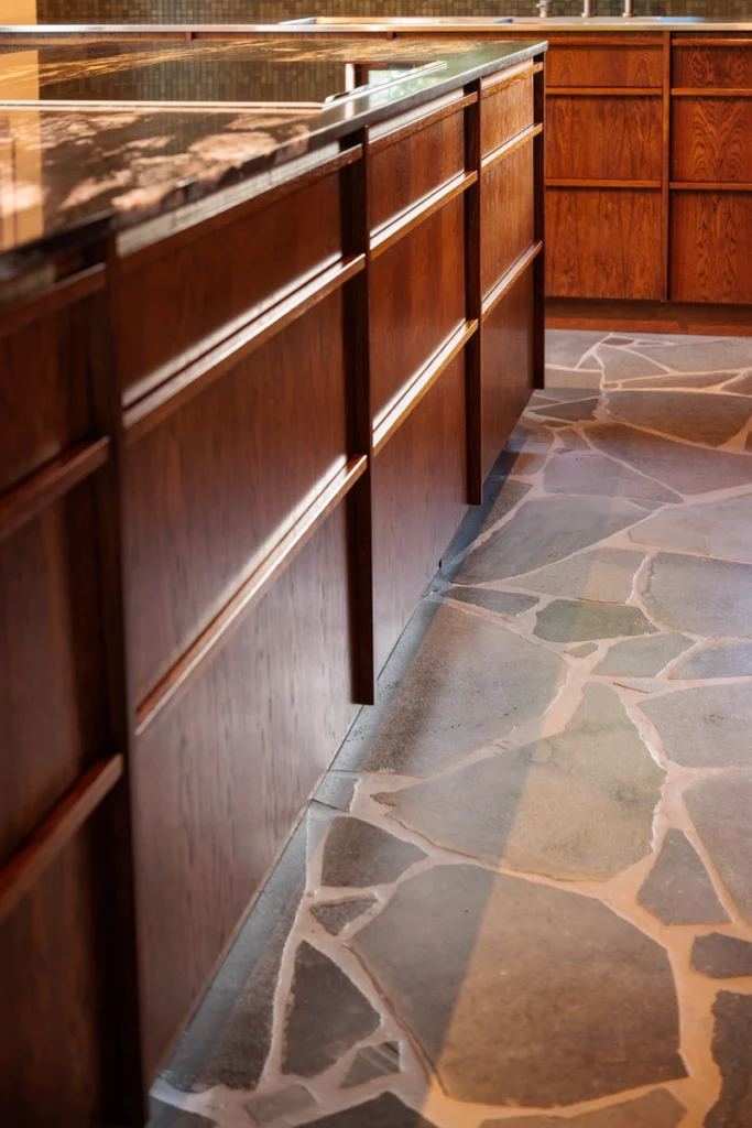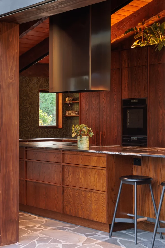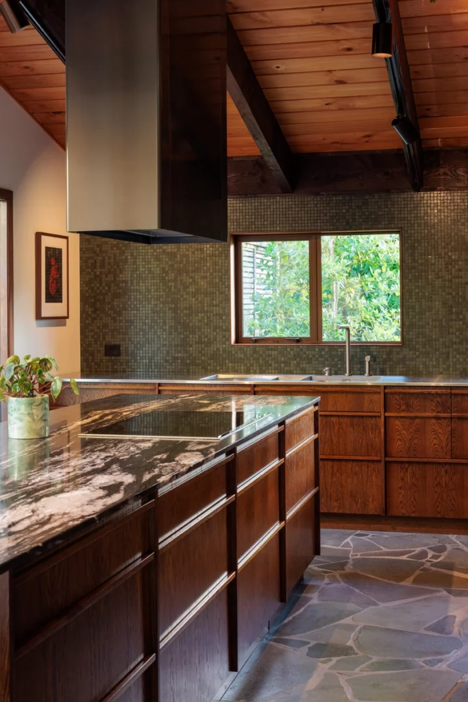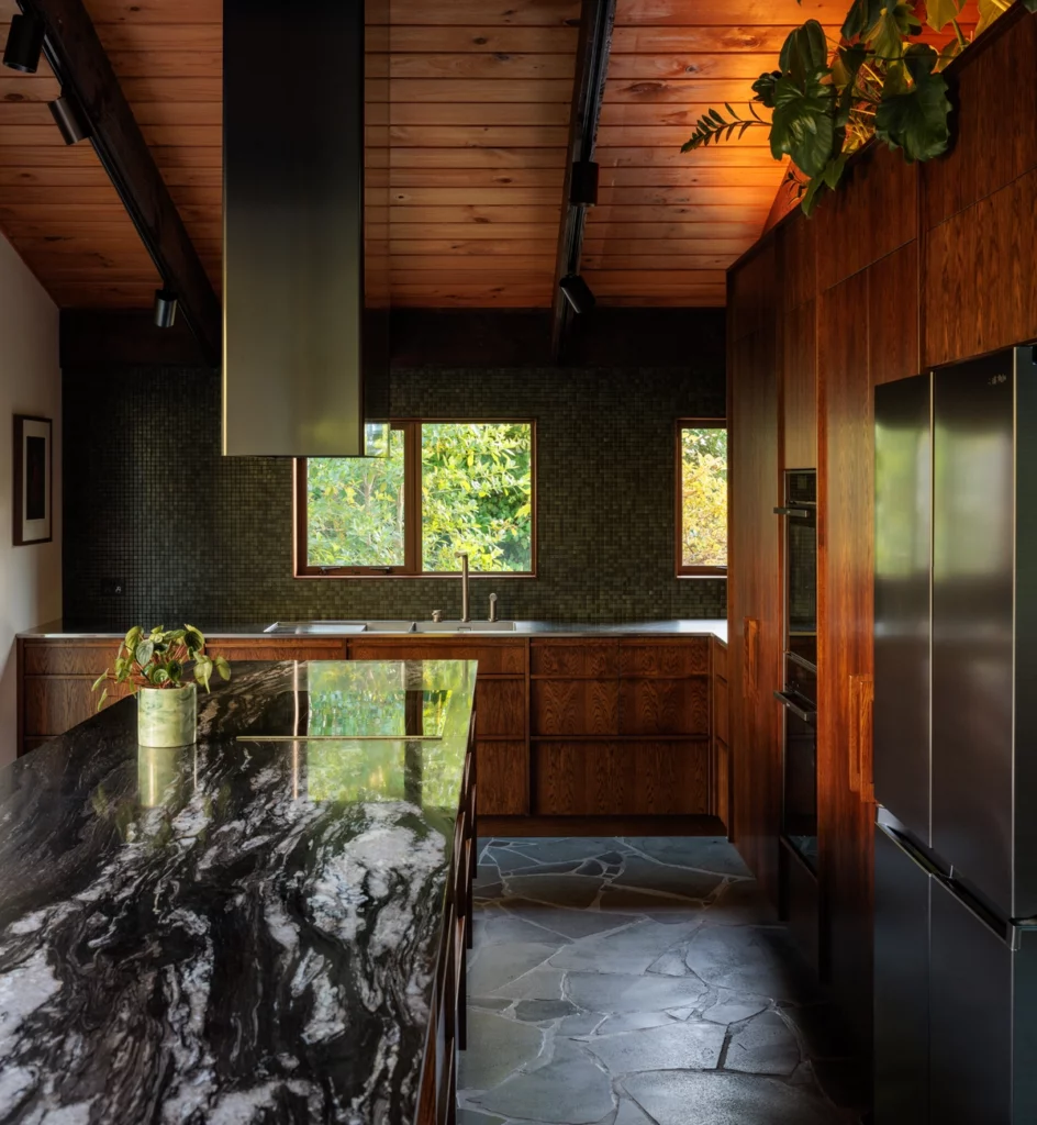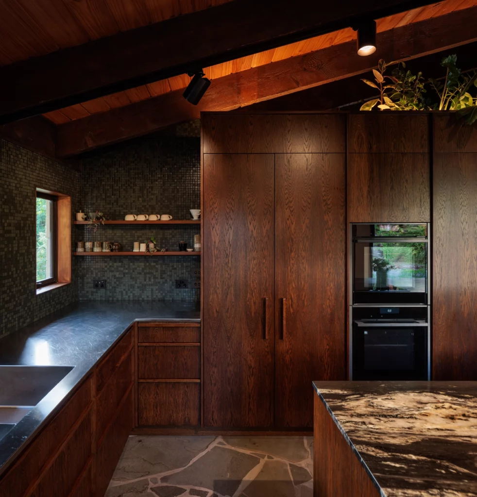Moody lighting coupled with a sensual combination of natural textures and surfaces make this kitchen a real showstopper!